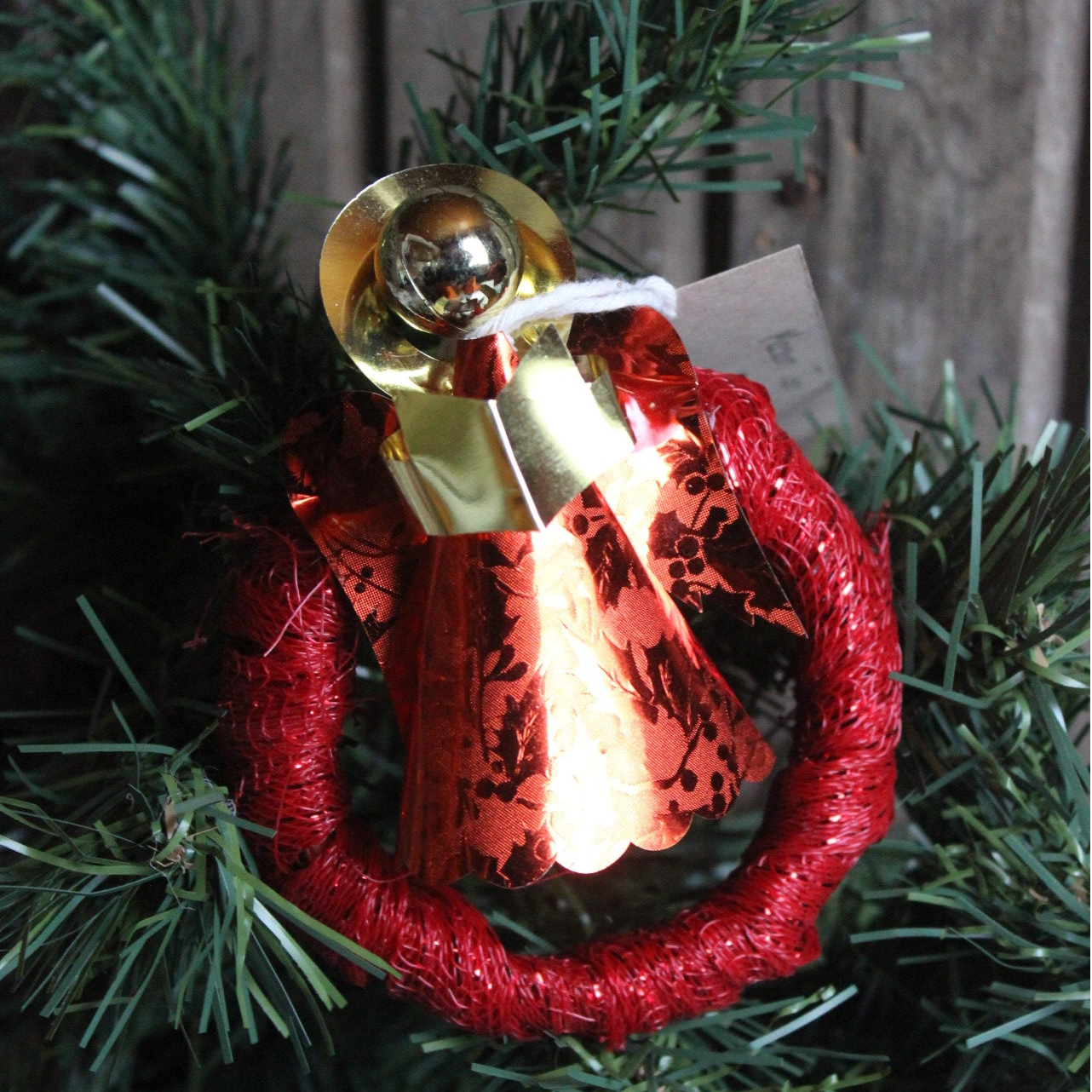 This is a upcycled mason jar ring. It is wrapped with red mess ribbon. And has a vintage 1980s paper plastic angel on the front. It has a gold string to hang the ornament on your tree.