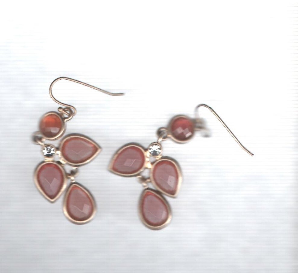 These are dangle earrings. They hang about 2 inches from the lobe. They are made of clear pink gem stones and they have gold trim.