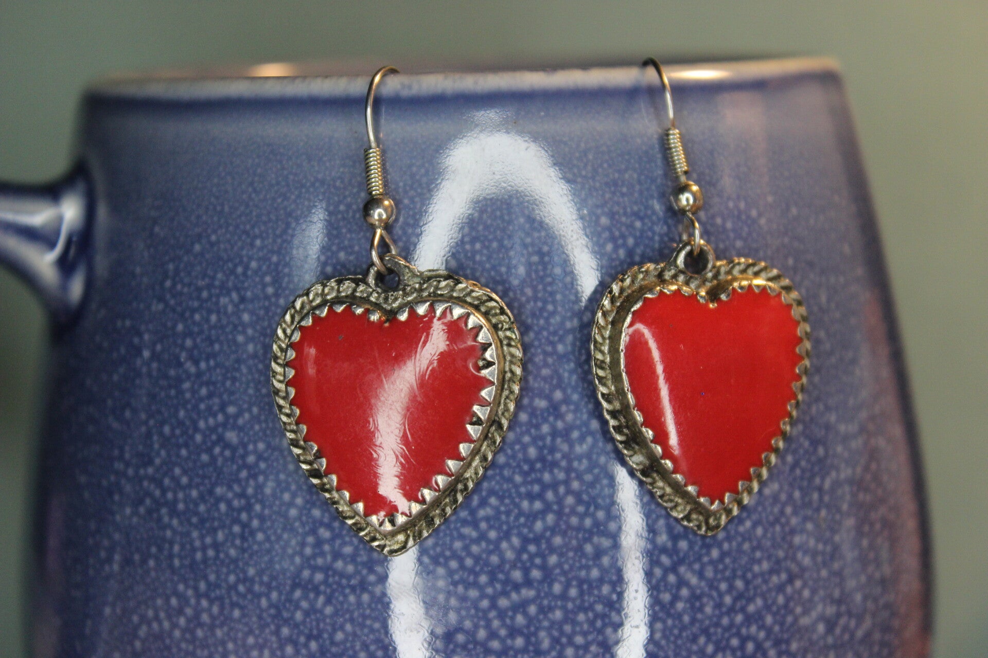 These are vintage 1990s. They are silver metal wtih enamel for the color design. The size of the heart is about the size of a quarter. There is some wight to them but they are not to heavy