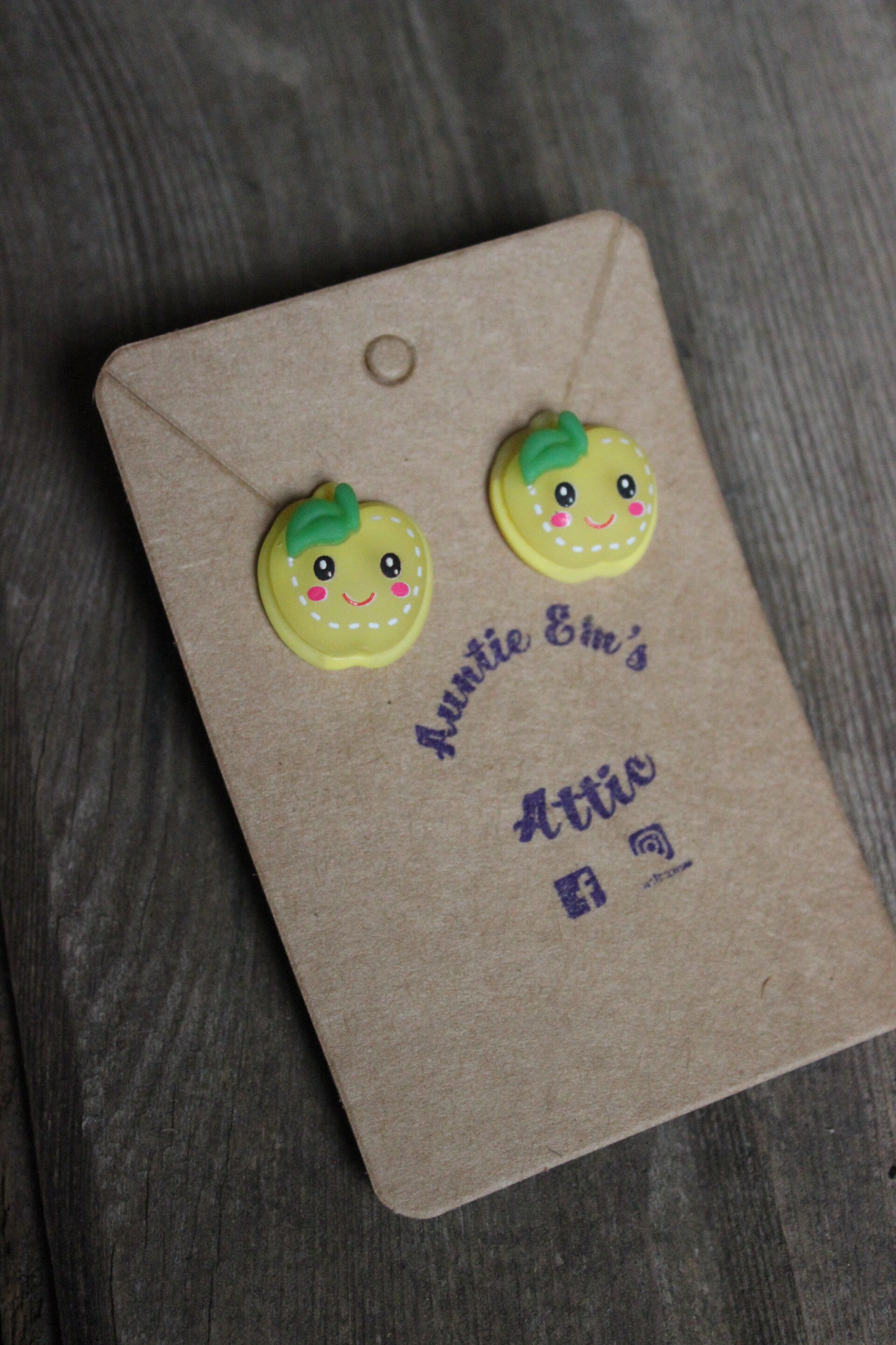 These are earrings that are made from a plastic and rubber charm. They have metal posts and backings. They are about the size of a dime.
