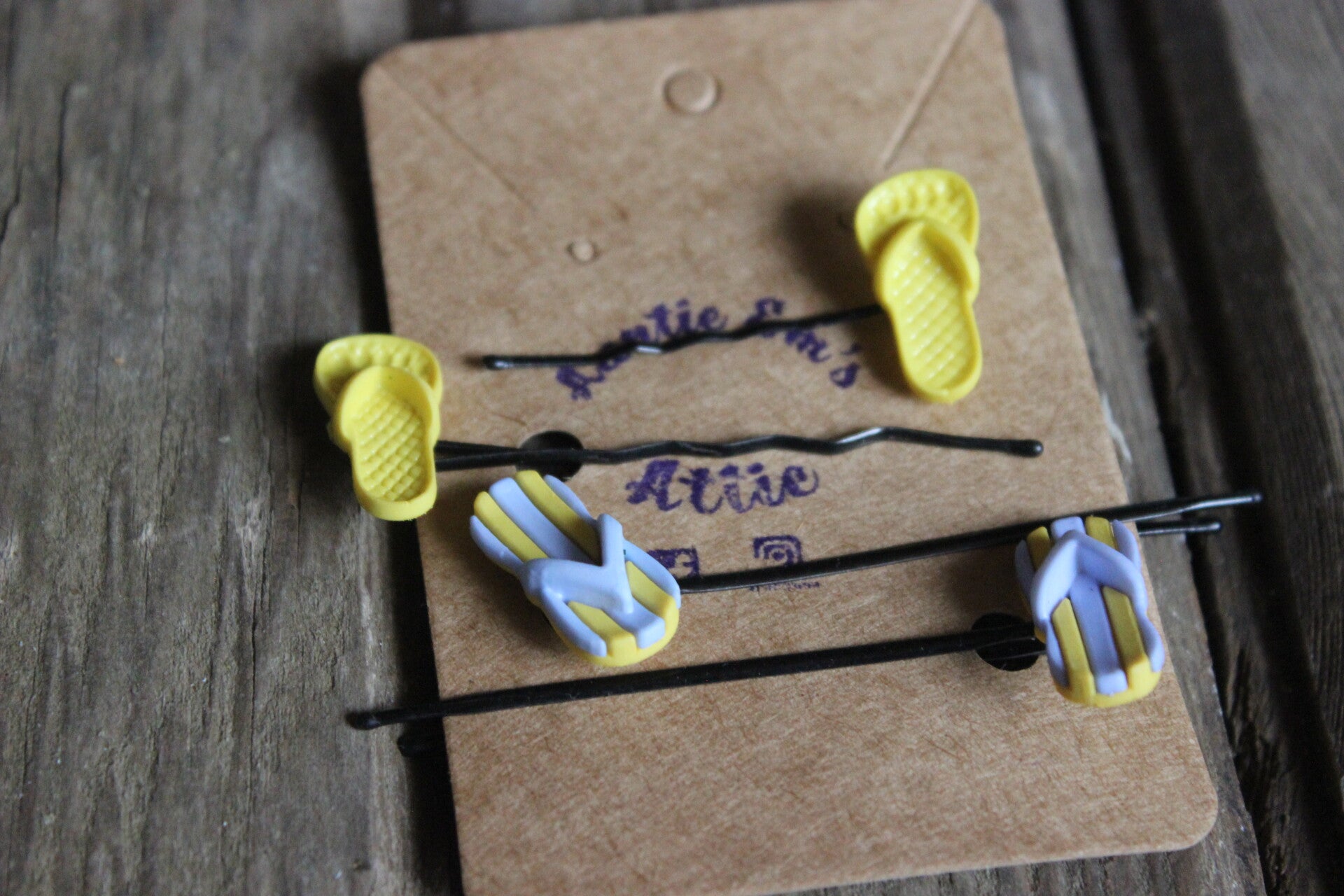 These are plastic flip flop buttons that are made into hair pins. The hair pins are metal. The buttons are about the size of a dime. They come in a set of 4.