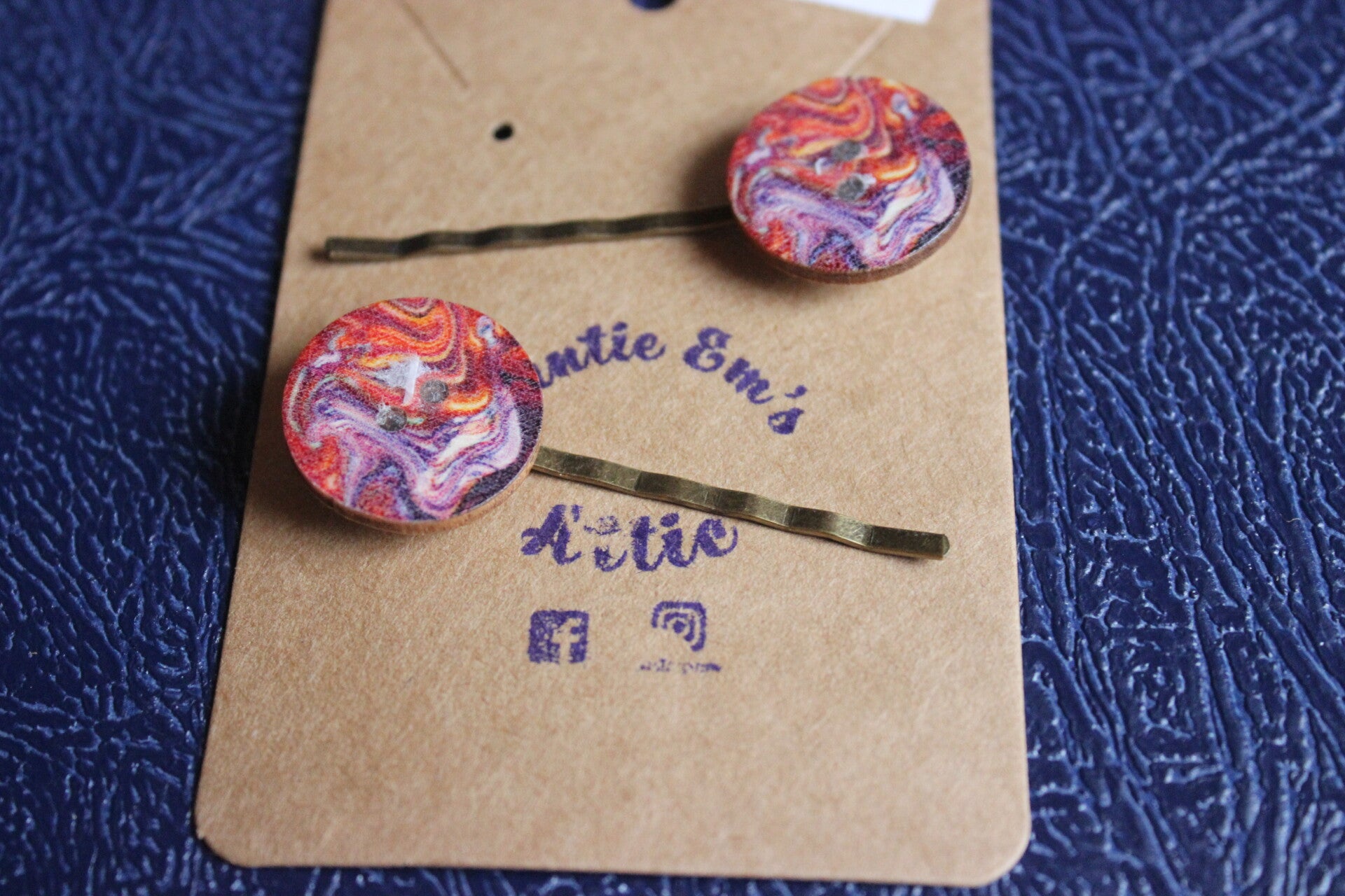 This is a set of hair pins that are made of wooden buttons that are dip pianted. And they are attached to metal hair pins. The buttons are about the size of a nickle.