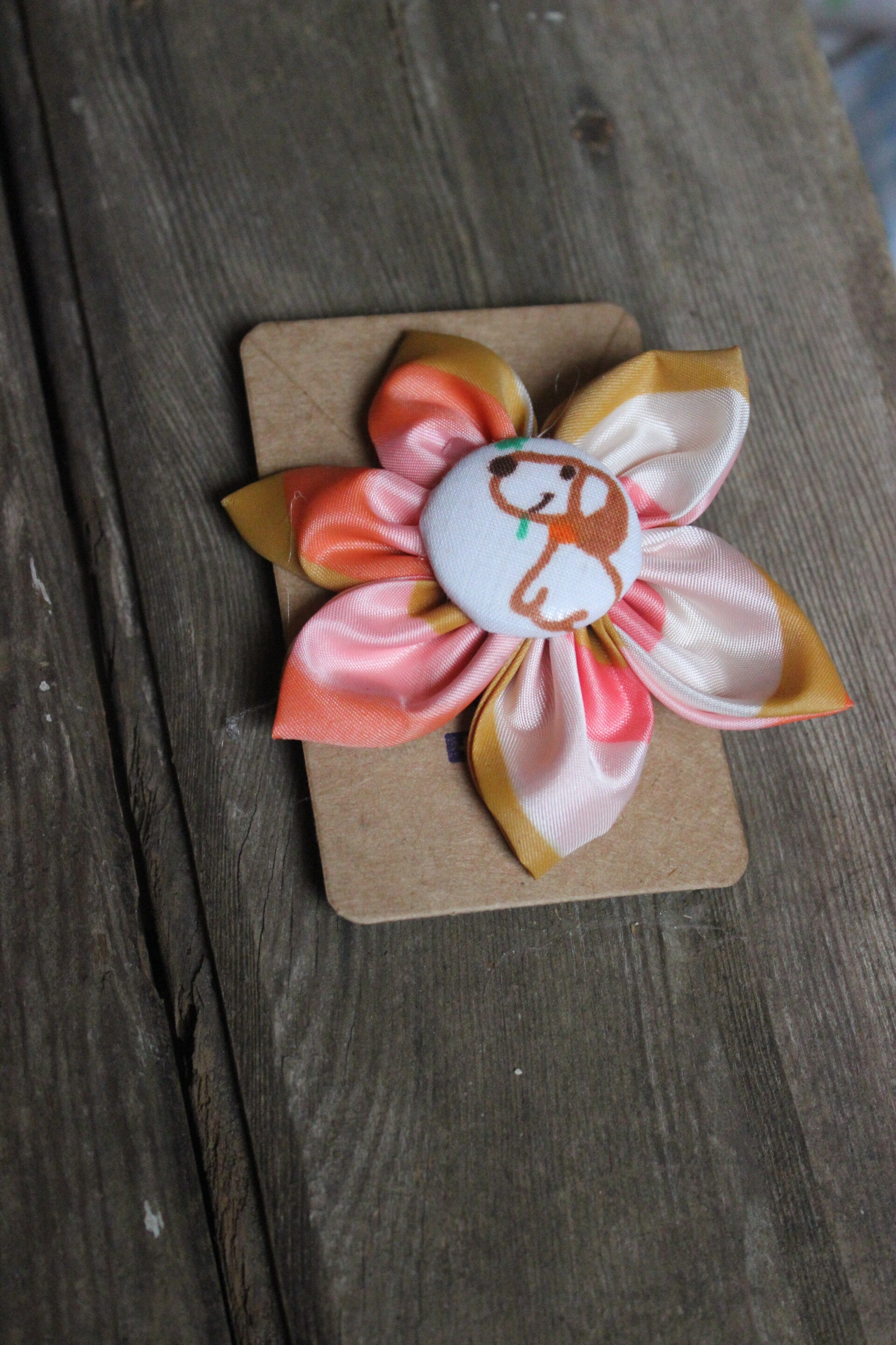 This is vintage puppy fabric that is sewn into a flower. It is attached to a metal snap barrette.