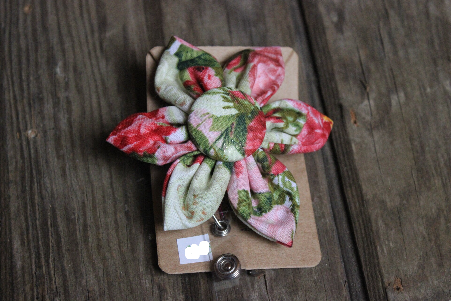 This is a vintage fabric that is sewn into a flower. It is then mounted onto a retractable name badge holder.
