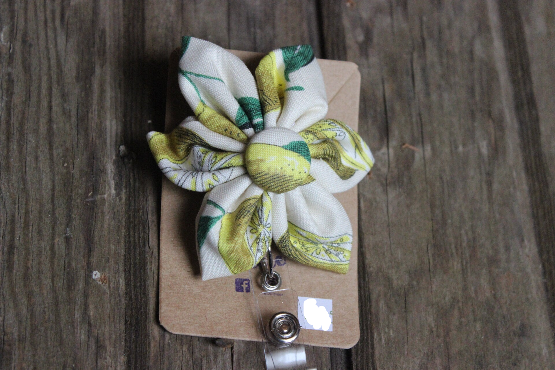 This is kitchen curtains hand sewn into a flower and attached to a retractable name badge holder.