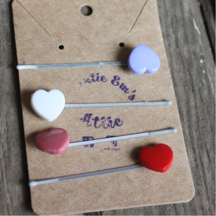 These are plastic heart buttons that are made into a set of 4 hair pins. The clips are made of metal.