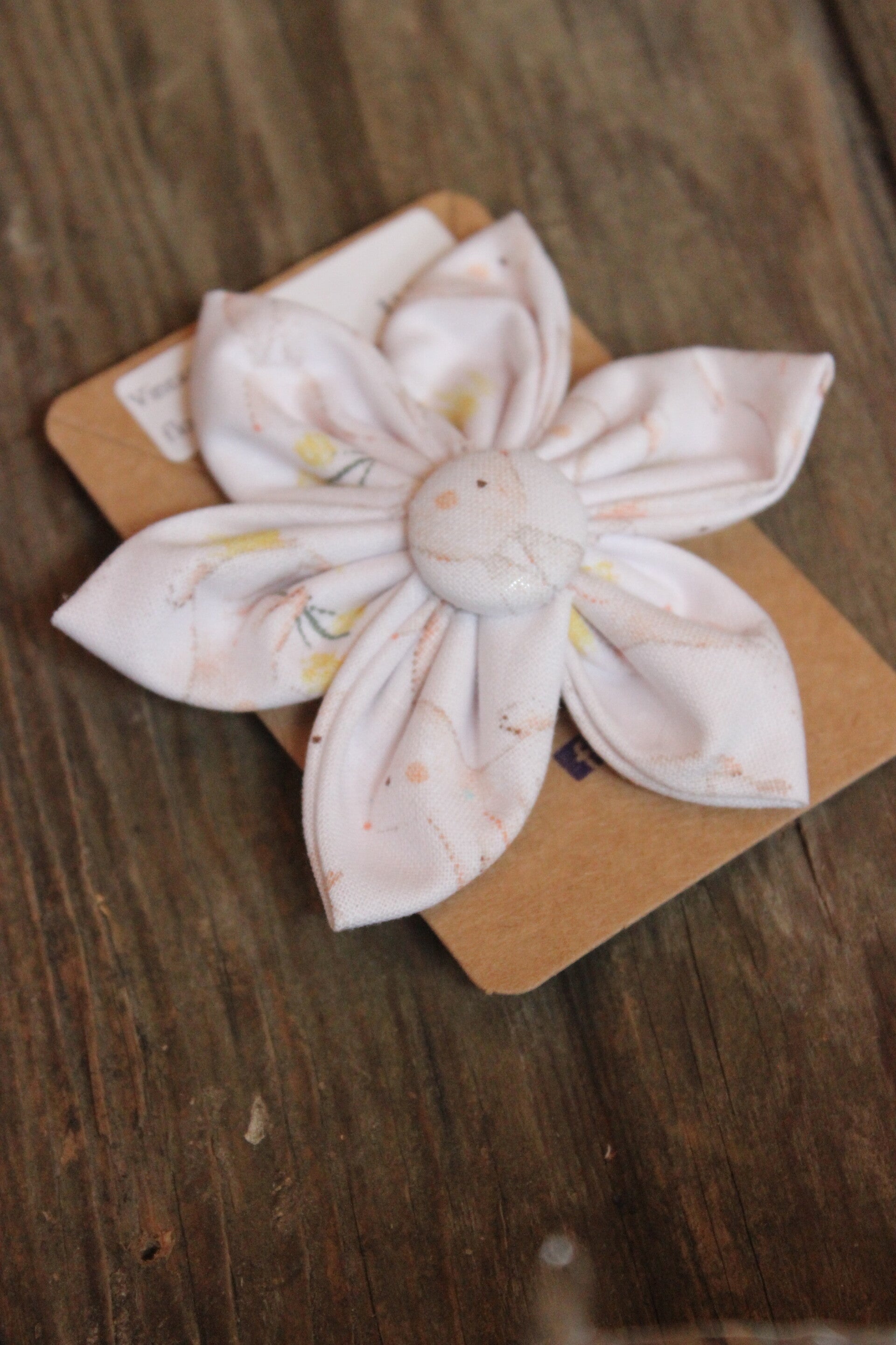 This is a hand sewn flower from upcycled fabric. It is then mounted onto a metal barrette with a clasp closer.