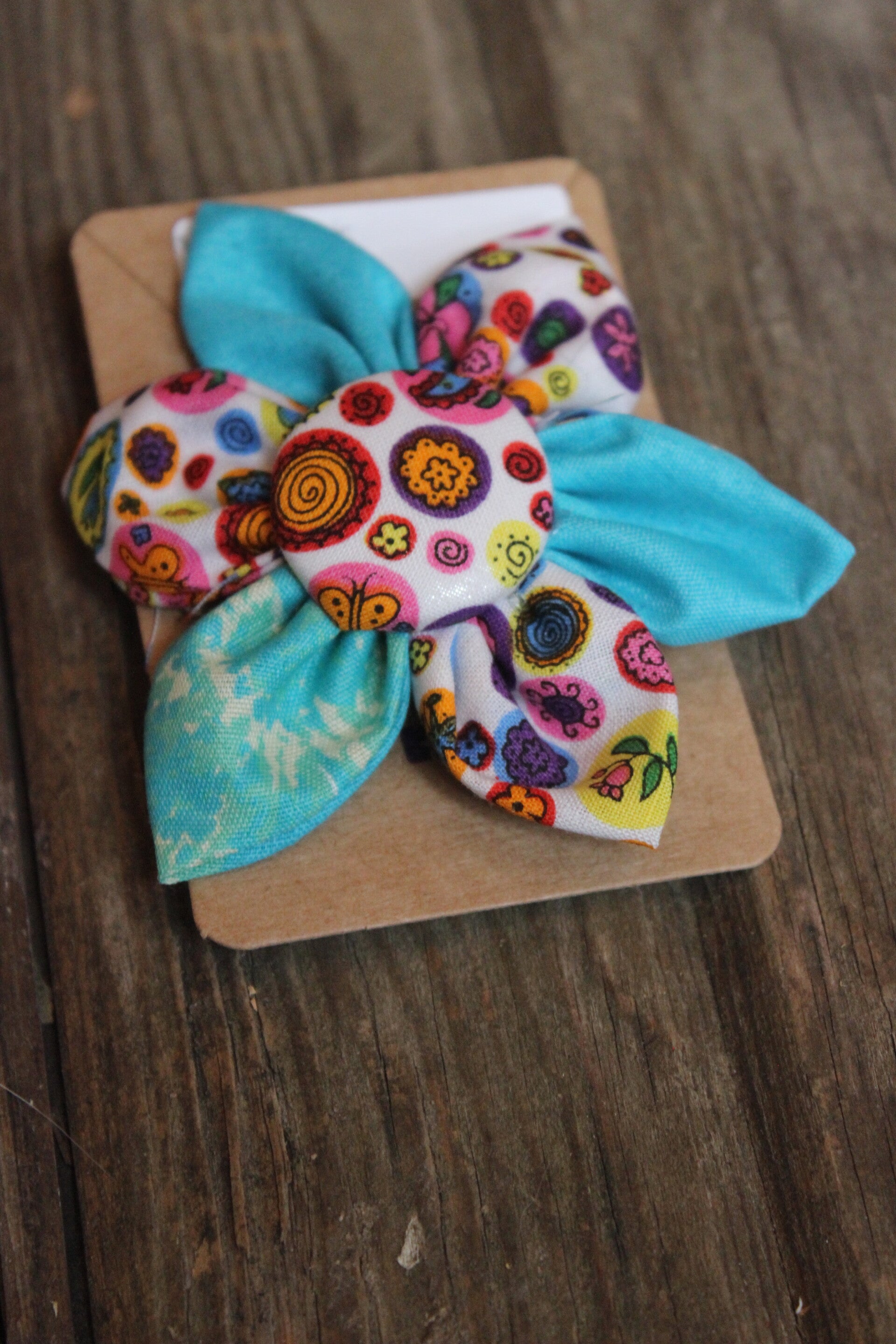 This is a hand sewn fabric that has interesting patterns. It is attached to a metal barrette backing that has a clasp closer.