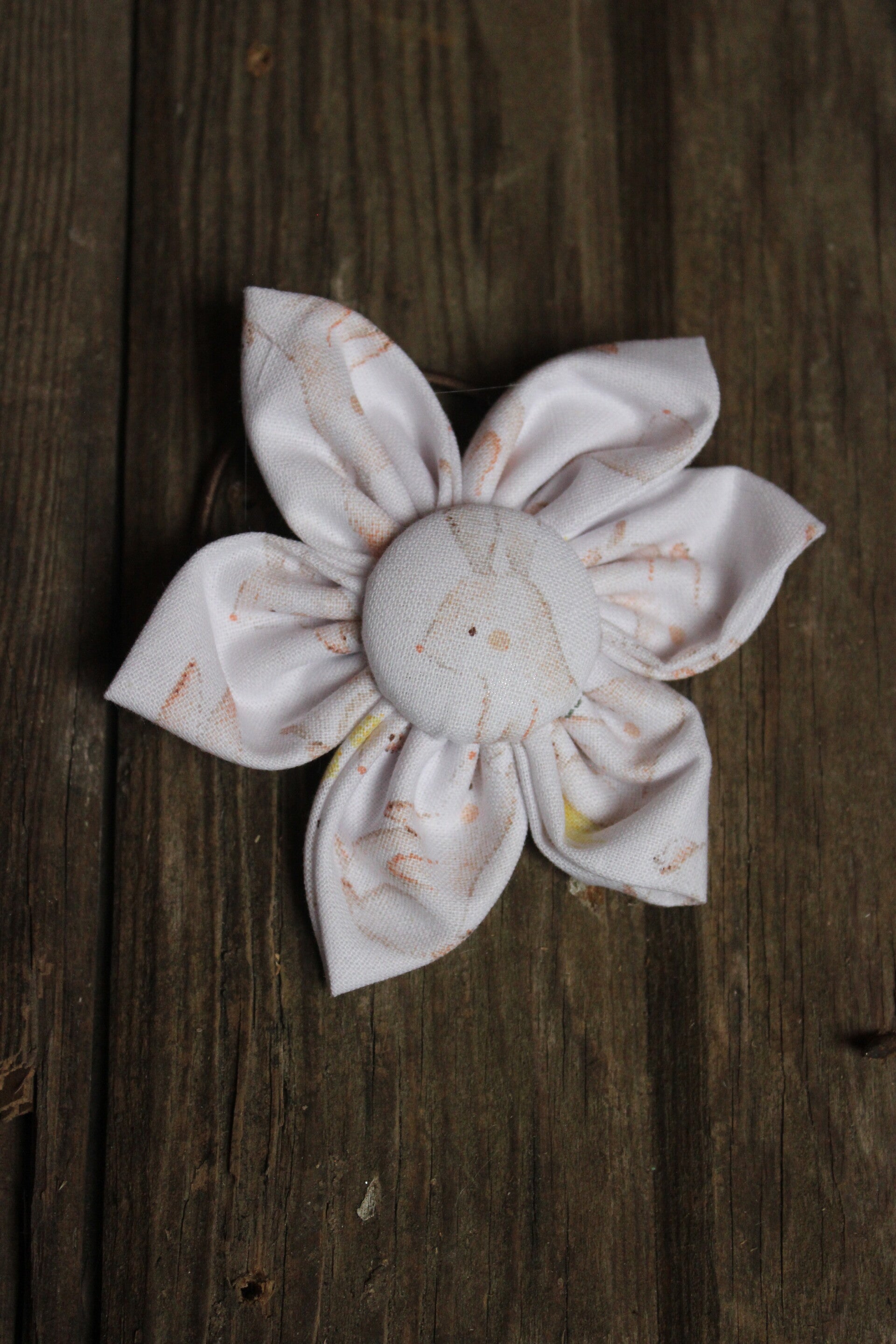 This is a hand sewn fabric into a flower. It has a bunny for the center of the flower. It has a pony tail tie attached to the back of the tie wtih a strip of felt.