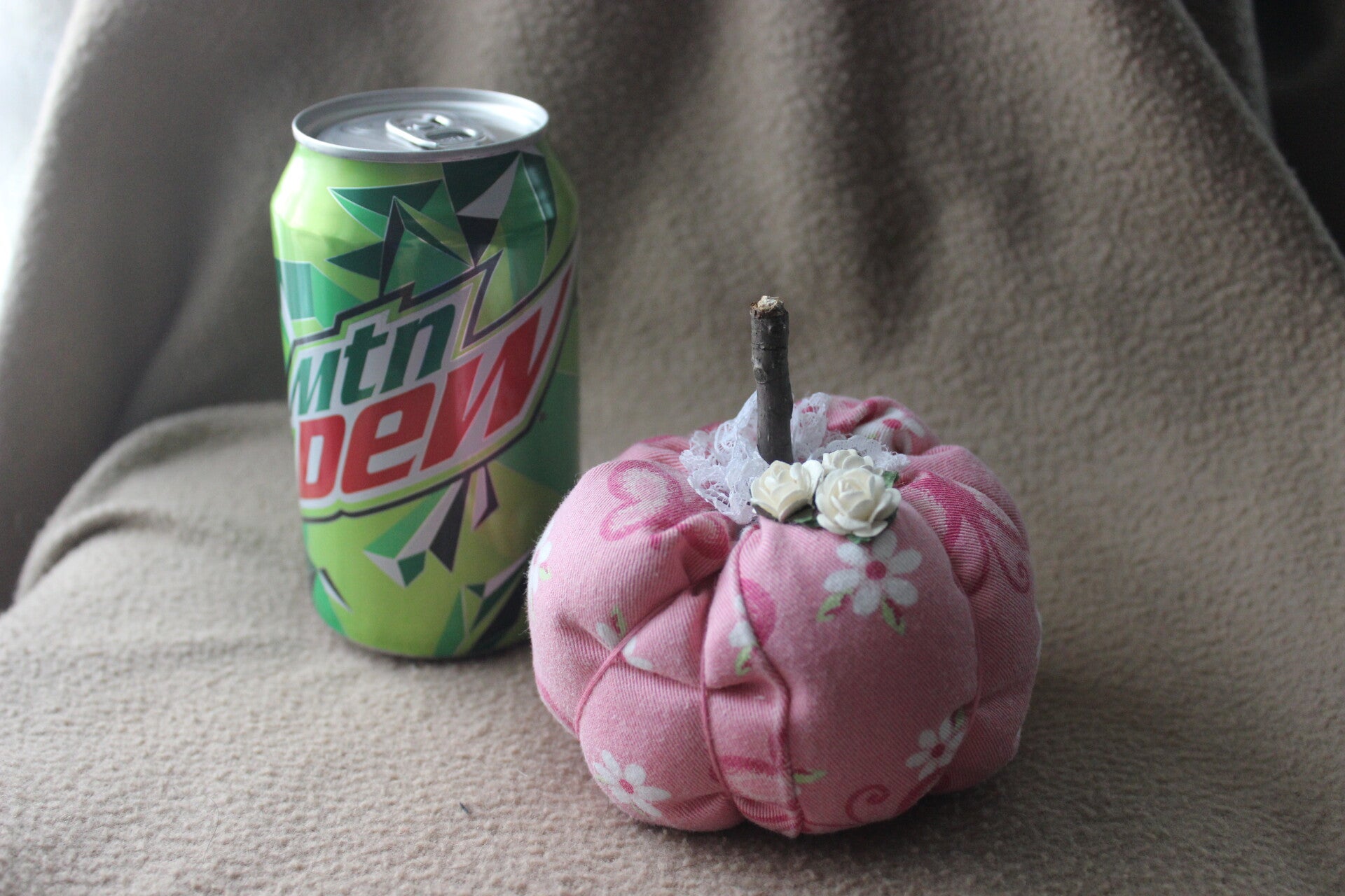 This is a soft fabric pumpkin. Its fabric was once toddler pants. It has a wooden stem and lace around the top. The pop can is there for size only.