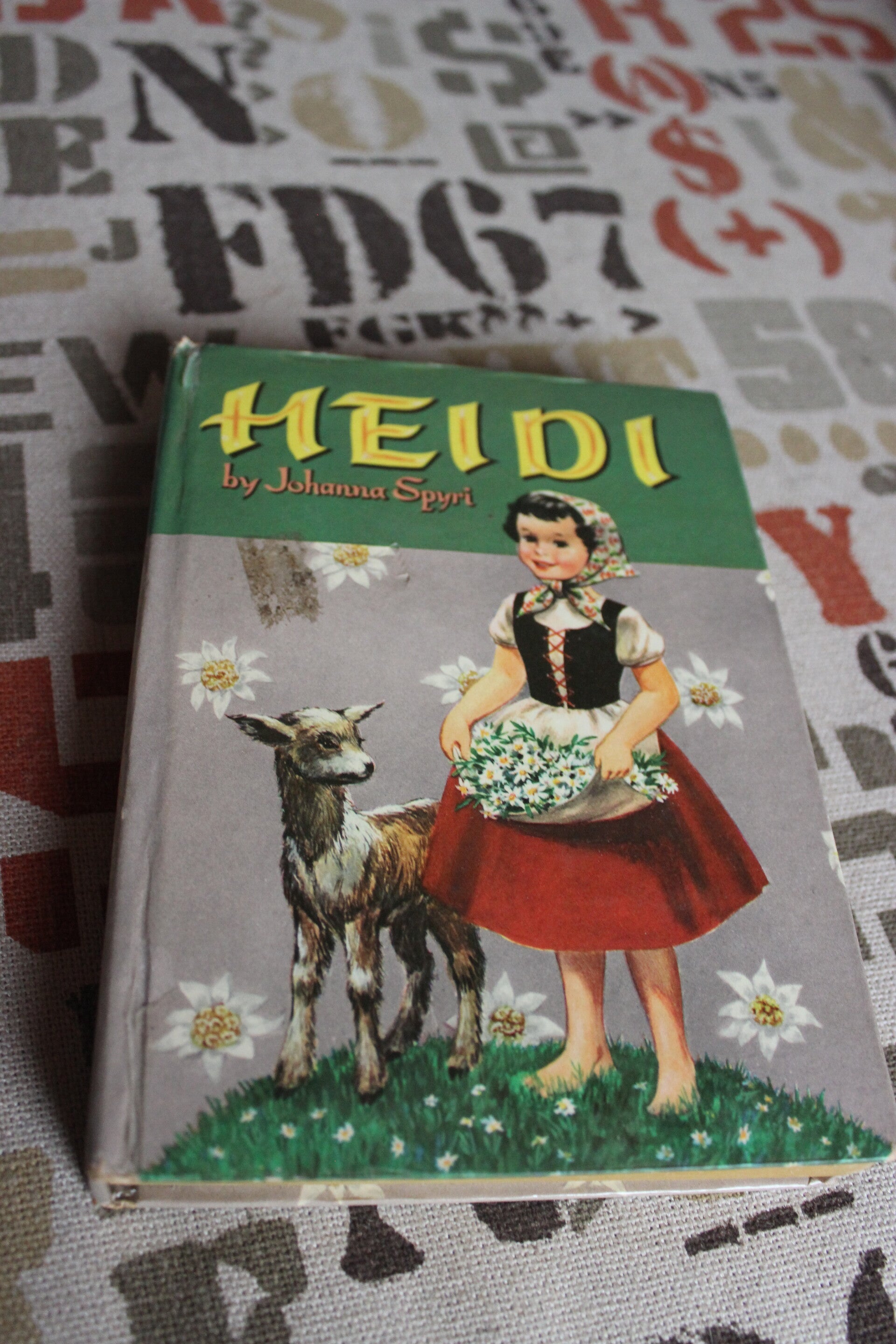This is a Copyright of 1959 Hard back of the book Heidi. It's binding is lose from the cover when opened. But the page binding is stiff and in good shape. The pages are yellowed with age. The front and back of the cover have a really nice graphic.