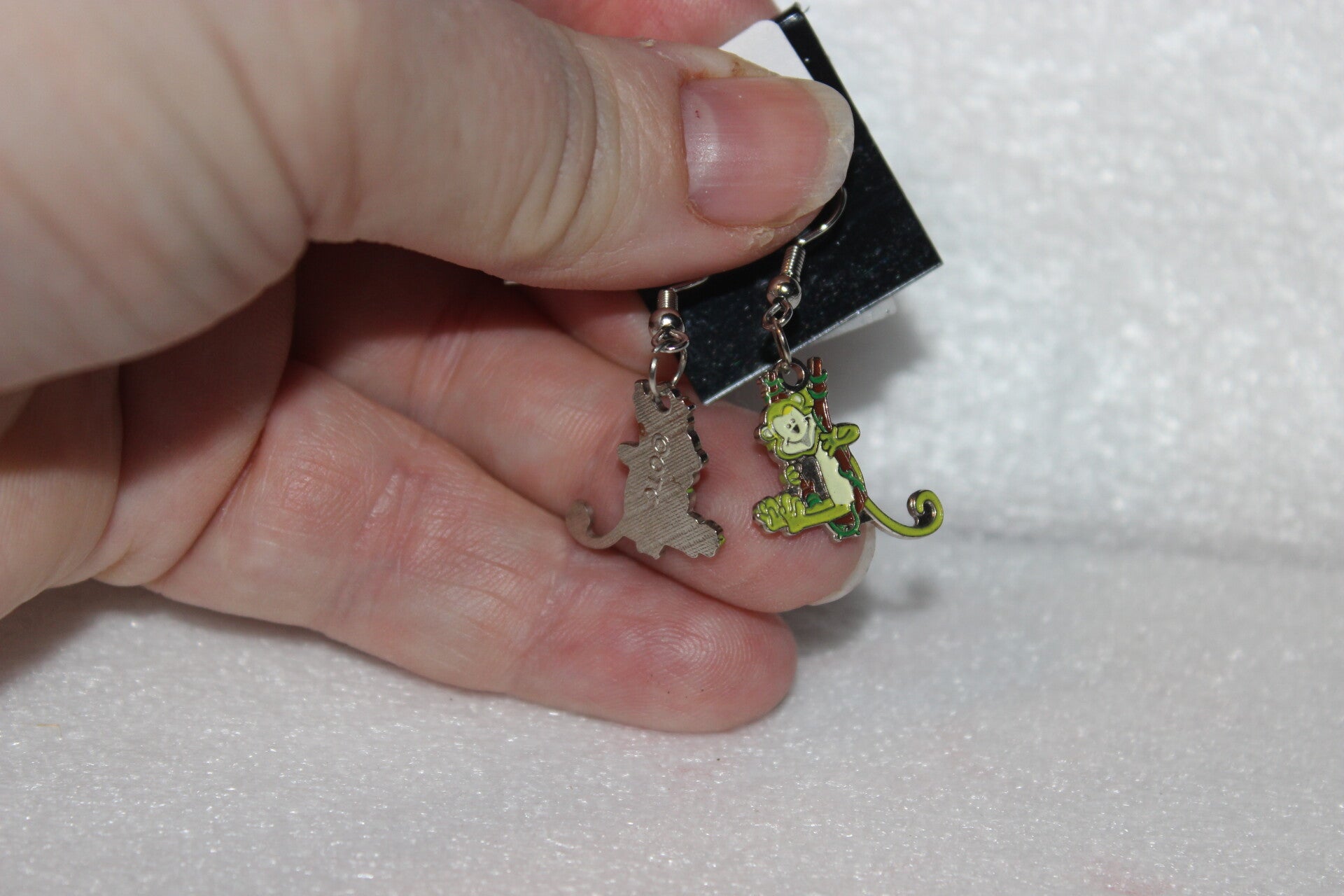These are metal monkeys that dangle from a lock style earring. They dangle about 1 inch from the lobe.