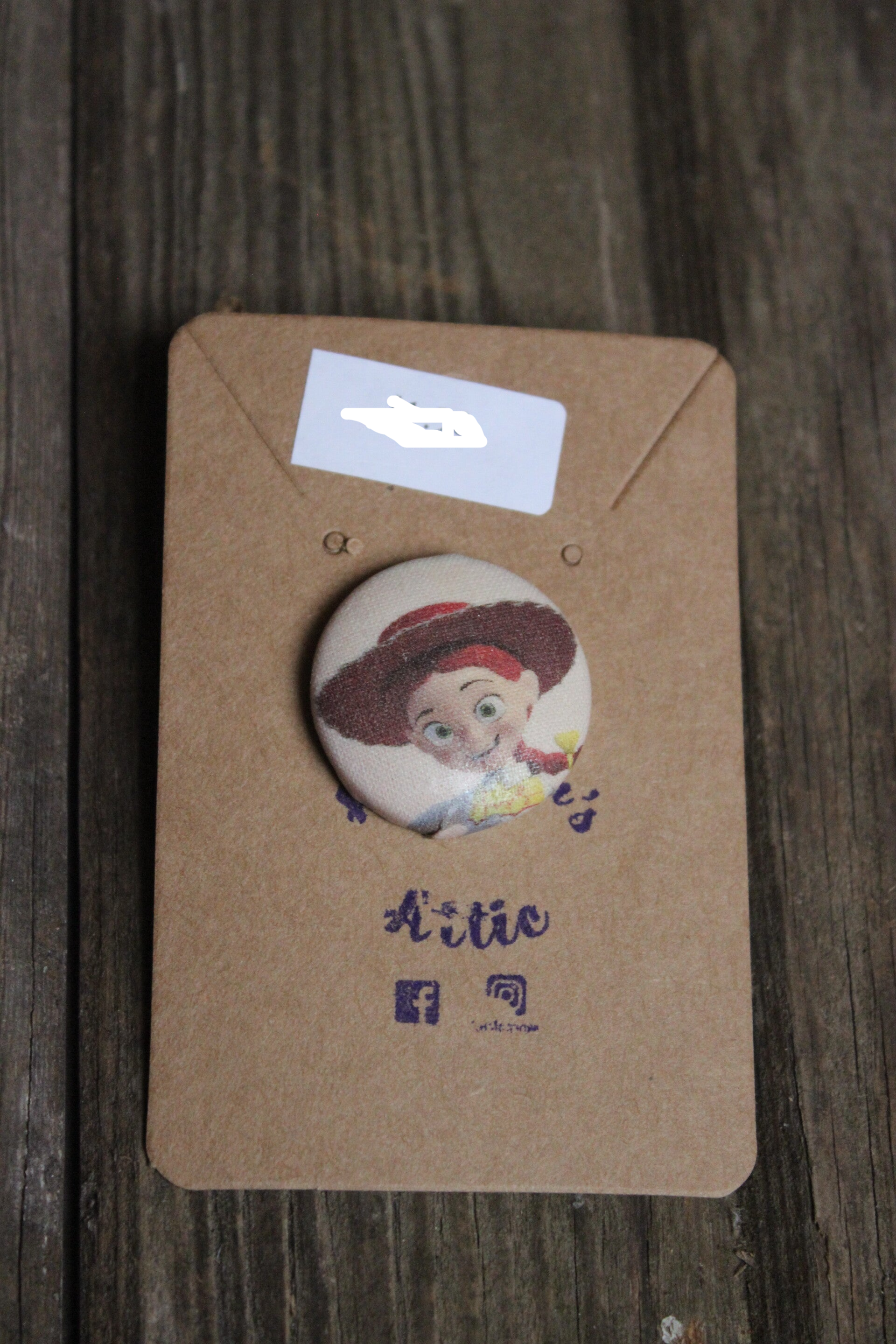 This is an image of Jessie from toy story. It is printed on fabric then made into a button that has a metal backing. It is about the size of a quarter.